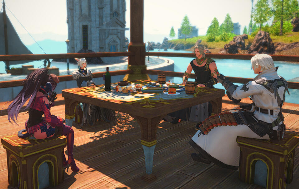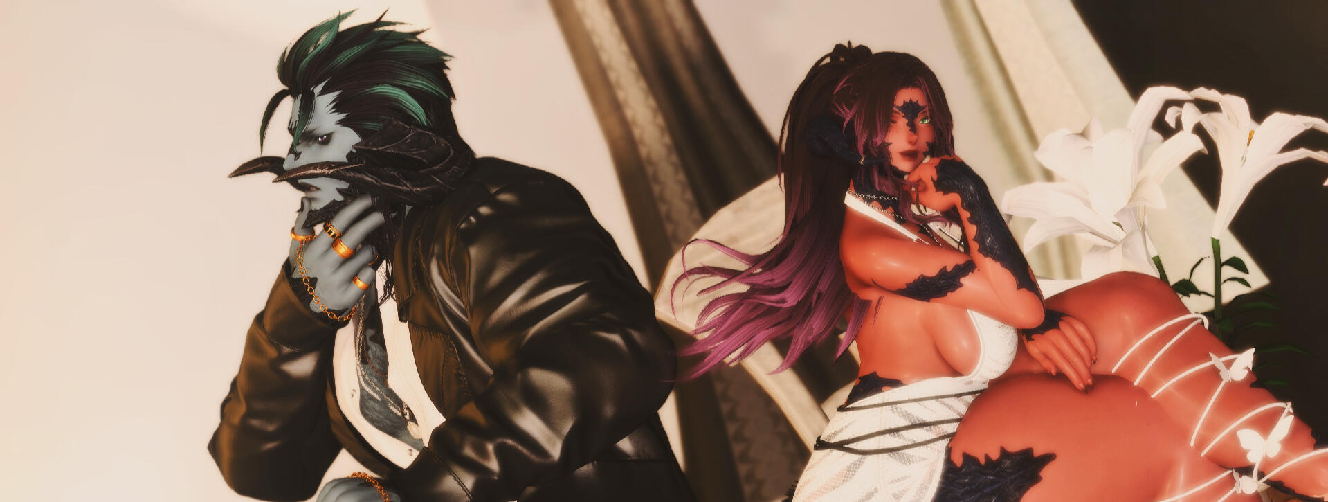 Their meeting was by random in Kugane. With a job finished, the golden dragon decided to reward himself with a soak in the springs. She was getting done with rewarding herself with a trip to the markets. His towering figure caught her eye and the two formed a unusual friendship after a long chat. He has since learned that her ambitions have no limits. The two eventually became business partners for her hostess club as an /investor/.