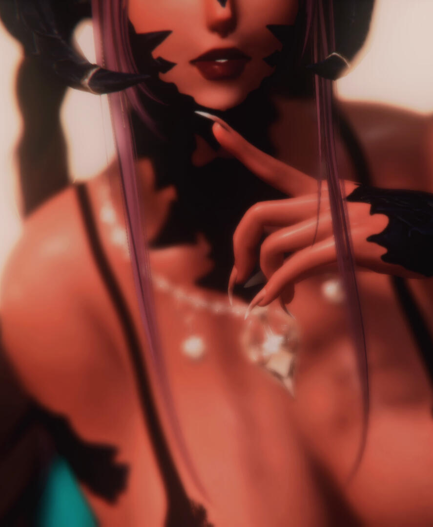 APPEARANCE Claudia has a short build, a height just barely reaching five fulms. Long luscious brunette hair drapes her back, dipped in lavender highlights. Dark blue scales adorns the sides of their face, covering her neck and decorating parts of her body, with curved horns protruding from the sides of her head. A slender long tail extends out, reaching close to the floor with a silver chain attached at the end.